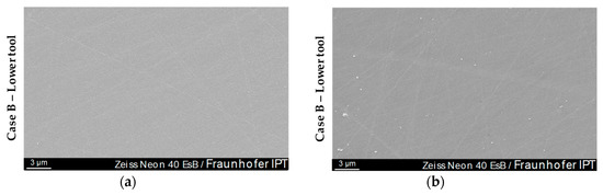 Alterations of the Glassy Carbon tool surface of 30 moulding cycles analysed by SEM: (a) Case A—lower tool; (b) Case B—lower tool.