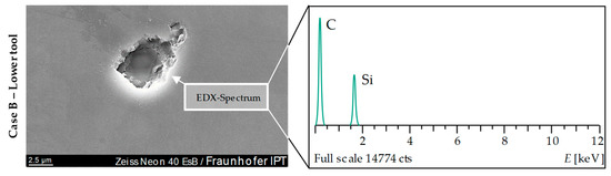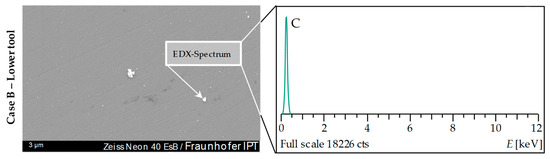In addition, the Glassy Carbon forming tools—with the exception of the Case 0 sample pair—were measured with SEM (Scanning electron microscope) microscopically on their surface after each 20 pressing cycles. Since the SEM investigations conducted by Dukwen et al. [19] showed up to 0.5 μm large damages of the Glassy Carbon surface after 20 pressings, the same images should be carried out for reasons of direct comparability. In addition, EDX analyses were performed to determine the material composition of defects or anomalies, which were not examinable by means of Light Microscopy or AFM.