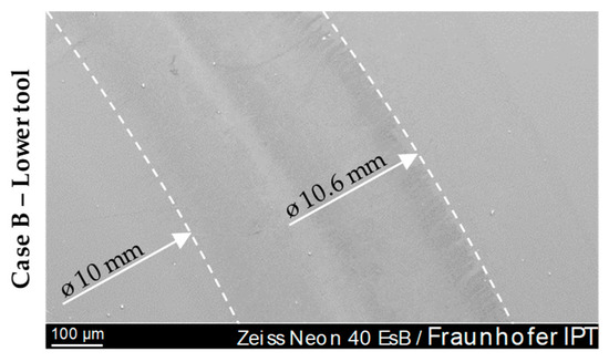 All cases show more or less the same behaviour, especially in terms of differences between upper and lower tool. It is remarkable that the lower tool of Case B (cBN treatment) exhibits a much wider and easily visible wreath at the edge of the glass contact area.