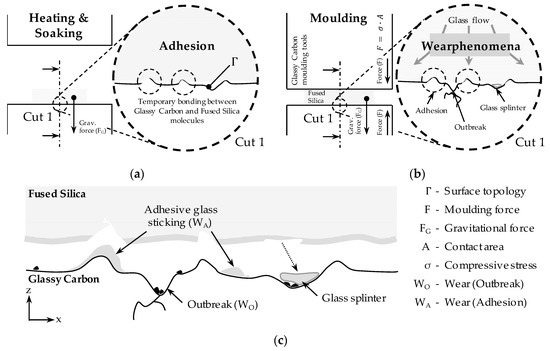 Extended wear evolution model of Fused Silica moulding with Glassy Carbon moulding tools (based on [27]): (a) Temporary bonding between the contact partners; (b) Conditions during moulding phase; (c) Wear result after moulding and detachment of the moulded glass component.