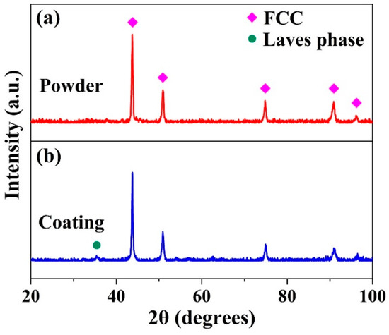 X-ray diffractometer (XRD) patterns of (CoCrFeNi)95Nb5 high-entropy alloy (HEA) powder (a) and coating (b).