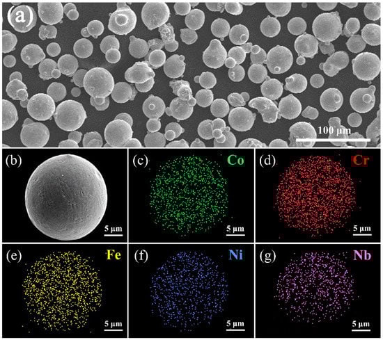 The SEM image of (CoCrFeNi)95Nb5 HEA powder is shown in Figure 2a. It can be seen that the powder is nearly spherical, and the diameter of the particles is from 10 μm to 30 μm. As seen from Figure 2b, the surface of the spherical powder is not smooth, distributing inhomogeneously as a grid. The EDS results (Table 1) and mappings (Figure 2c–g) of HEA powder indicate that composite of powder is very close to the designed nominal composition and the distribution of each element in the single powder is highly uniform.