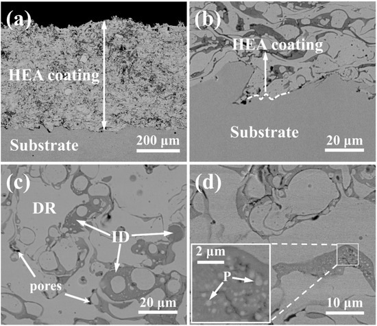 Figure 3c presents the microstructure of cross section of the (CoCrFeNi)95Nb5 HEA coating. It was found that the dendrites with white contrast (marked as DR) and interdendrites with gray contrast (marked as ID) show an approximately equiaxed morphology, and black areas are pores. The chemical composition of the dendritic phase and the interdendritic phase was analyzed by EDS, and the results are shown in Table 1. It has been demonstrated that Cr and Nb elements are enriched in the interdendritic phase, while Co, Fe and Ni are mainly concentrated in the dendritic region. Similar composition segregation phenomena have also appeared in the study of Liu et al. [7]. It is noteworthy that a lot of rounded precipitates (marked as P) are found in the gray phases, as shown in the inset of Figure 3d and the corresponding elemental composition was analyzed by EDS. From Table 1, the precipitated phase is rich in Co, Fe, and Nb.