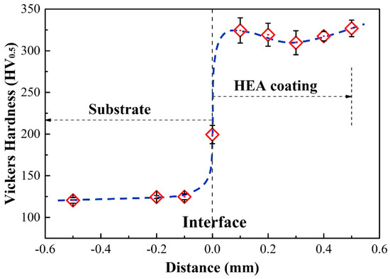 In order to investigate the mechanical behavior of HEAs coating, the microhardness varying from the substrate to the surface of the (CoCrFeNi)95Nb5 HEA coating is tested as shown in Figure 5. The results show that the microhardness of the HEA coating, 310~325 HV0.5, is significantly higher than that of the Q235 steel substrate, ~122 HV0.5, and the hardness of the interface is between such two parts. The change trend of microhardness corresponds to that of microstructure and composition, as shown in Figure 3 and Figure 4. It means that HEAs coating with high microhardness, which is attributed to the solution strengthening caused by the high size mismatch between Nb with Co, Cr, Fe, and Ni, and the precipitation strengthening caused by the precipitation of the ordered Laves phase, can effectively improve the comprehensive mechanical property of the substrate.