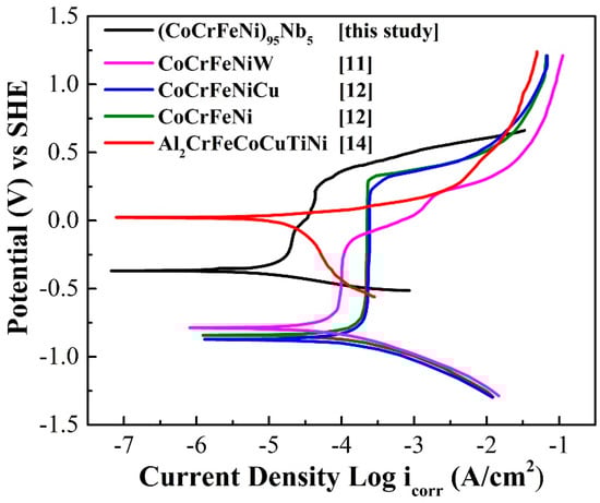 The polarization curve of (CoCrFeNi)95Nb5 HEA coating in 3.5 wt.% NaCl solution is shown in Figure 6. For comparison, Figure 6 also exhibits the polarization curves of other HEA coatings prepared by other processes in 3.5 wt.% NaCl solution, and the corrosion dynamics parameters of all HEA coatings obtained by linear fit are given in Table 2. As can be seen, the (CoCrFeNi)95Nb5 HEA and Al2CrFeCoCuTiNi HEA coatings have higher corrosion potential than other coatings, and the (CoCrFeNi)95Nb5 HEA coating also possesses the lowest corrosion current density, indicating that the (CoCrFeNi)95Nb5 HEA coating has excellent comprehensive corrosion resistance in 3.5 wt.% NaCl solution. Furthermore, although the pitting potential of (CoCrFeNi)95Nb5 HEA coating is similar to that of other CoCrFeNi-based coating, the lower passivation current density of (CoCrFeNi)95Nb5 HEA coating means the better pitting resistance.