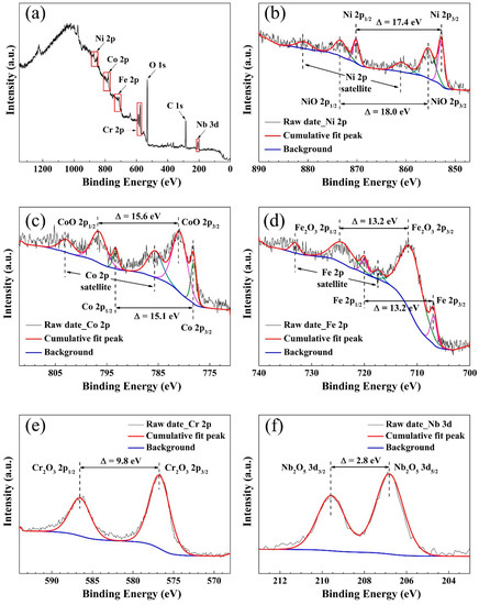 Electrochemical experiments have demonstrated that the (CoCrFeNi)95Nb5 HEA coating exhibits excellent corrosion resistance, and that the passivation film of the coating may play an important role. To prove this guess, chemical compositions of the passive film formed on the surface of the (CoCrFeNi)95Nb5 HEA coating after air oxidation were investigated by XPS. Figure 8 shows the XPS spectra of the passivation film on the surface of HEA coating in air. The full survey spectrum (Figure 8a) exhibits that the passivation film contains seven elements of Co, Cr, Fe, Ni, Nb, O, and C [19]. The peaks of Ni 2p correspond to Ni and NiO (Figure 8b). The Co 2p peaks are determined as Co and CoO (Figure 8c). The peaks of Fe 2p are identified as Fe and Fe2O3 (Figure 7d). The Cr 2p peaks correspond to Cr2O3 (Figure 8e). Lastly, Nb2O5 (Figure 8f) is observed in the peaks of Nb 3d.
