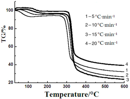 The dehydration process is generally not considered to affect the thermal decomposition of starch, because all water will evaporate before the decomposition of the sample in the open system. Even though the form of the thermogravimetric curves does not change, the starting temperature of decomposition is the same, and the maximum of temperature increases with the increasing heating rate. This phenomenon is probably ascribed to a heat transfer problem between the sample and the equipment [21], and the reason may also be that the rapid heating leads the sample to the given temperature rapidly as a result of the increased thermal lag [22,23]. These curves were used for the calculation of dynamics parameters including activation energy and pre-exponential factor.