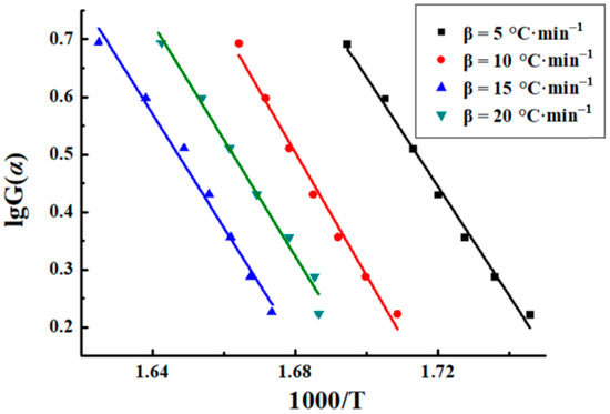 The Flynn–Wall–Ozawa model was also employed to process the thermogravimetric curves of sweet potato starch and calculate the corresponding dynamics parameters. From Figure 1, the peak temperatures of thermogravimetric curves at different heating rates, Tm, were obtained. Figure 4 illustrates the linear plot of lgβ vs. 1000/Tm, where slopes give −E/R. The linear correlation coefficient was 0.9981, and the activation energy was 174.87 kJ·mol−1. Thus, the Flynn–Wall–Ozawa model can also be applied to sweet potato starch.
