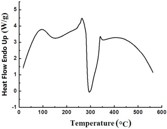 The DSC curve was used to study the thermal transformation occurring in the process of heating under an inert atmosphere. The typical DSC curve of sweet potato starch in a range of 40–580 °C is presented in Figure 6. The peaks at a low temperature (95 °C) are endothermic peaks of gelatinization. Just before this exotherm, there is an endotherm at 270 °C. After opening the DSC pans, the starch sample was yellow to brown. This change is believed to be due to the interruption of long chains. A large exotherm at about 280 °C nearly covers all the thermogram transition which represents the decomposition of starch. The result coincided with those obtained previously from thermogravimetric curves. After opening the DSC pans, the starch sample was carbonized when the temperature was greater than 280 °C. The carbon black directly indicated that the chains of macromolecules and the rings of low molecular glucose had been destroyed.