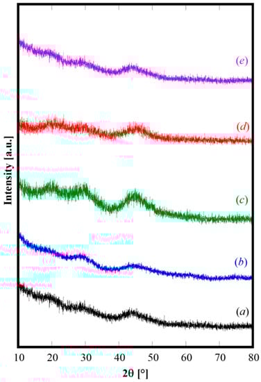 Obviously, the phases present in the amorphous coprecipitates are not directly detectable. Based on both literature reports [4,24] and on the related thermogravimetric analysis (See Figure 2), it can be deduced that the obtained amorphous phase could be a cerium(III) hydrated hydroxycarbonate wherein, depending on the actual composition of different samples, some Ce3+ cations are replaced by the dopant metals. In fact, indicating with RE cerium or the mixture of cerium and other rare-earth dopant cations (i.e., Gd, Sm, or Pr), the possible route forming the amorphous coprecipitate, as also suggesting by Hirano [26], is a two-step process: the first one, i.e., Equation (1), is the typical hydrolysis reaction of RE3+ cations in aqueous solution and the second one, i.e., Equation (2), is a precipitation reaction leading to the formation of insoluble amorphous rare earth hydroxycarbonate: