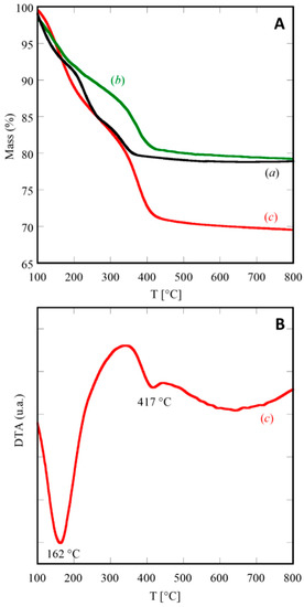 (A) Thermogravimetric analysis (TGA) curves of some selected samples: C (a), SDC20 (b), and GPrDC20 (c). (B) Differential thermal analysis (DTA) curve of sample GPrDC20.