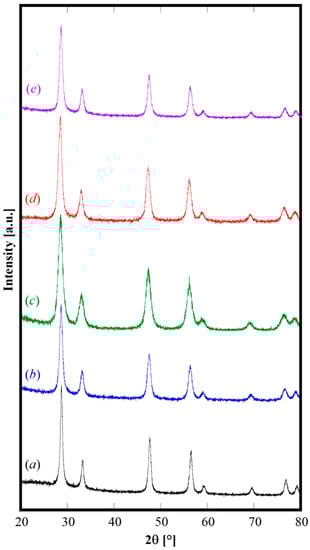 XRD patterns of calcined samples C (a), GDC20 (b), SDC20 (c), GPrDC20 (d), and SCaDC20 (e).