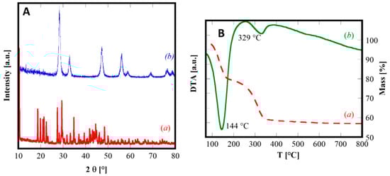 Even though the obtained precipitates were all amorphous, it is well-known [30] that ceria-based coprecipitates show a strong tendency to crystallize even at room temperature. The adopted chemical-physical condition (very short duration of the process, i.e., fast mixing and low excess of precipitating agent) are specifically selected to avoid the crystallization of the as-prepared coprecipitates which could negatively influence the morphology of the powders. In fact, by changing the precipitation parameters, the results can be very different. To highlight that, a further precipitation experiment was carried out in the presence of a large excess of ammonium carbonate (R = 10) and by slow mixing of the solutions A and B. In these conditions, the nature of the precipitated powders is quite different. Figure 5A(a) shows the diffraction pattern of as-synthesized SDC20R10S sample, perfectly highlighting the crystalline nature of this material, in which all XRD peaks are attributable to cerium carbonate octahydrate, belonging to the group of lanthanites owning orthorhombic crystal structure (corresponding to the ICDD, International Centre for Diffraction Data, card n. 83-1211). Actually, the XRD pattern in Figure 5 exhibits a small peak shift, but it is perfectly justifiable, as the composition reported in the ICDD card and the actual composition are rather different, being (LaCe)(CO3)3·8H2O and (Sm0.20Ce0.80)2(CO3)3·8H2O, respectively. The total weight loss measured by DTA-TG analysis (reported in Figure 5B) is approximately 43%, perfectly agreeing with the theoretical value of 43.3%, further confirming the complete crystallization of the orthorhombic Sm-doped cerium carbonate octahydrate, during the coprecipitation at room temperature with slow mixing and with a large excess of carbonate ions. The DTA plot reveals two endothermic peaks, the first one at 144 °C related to water evolution and the second one at 329 °C representing the global effect of carbonate decomposition, Ce3+ oxidation, and crystallization of fluorite-type ceria. By calcination at 600 °C for 1.5 h, as predictable from the DTA plot, the sample SDC20R10S is completely crystallized in the fluorite-type structure (see Figure 5A(b)). Its crystallographic parameters are reported in Table 2 and, in particular, it can be noticed the nearly equal lattice parameter compared to sample SDC20 owning the same composition.