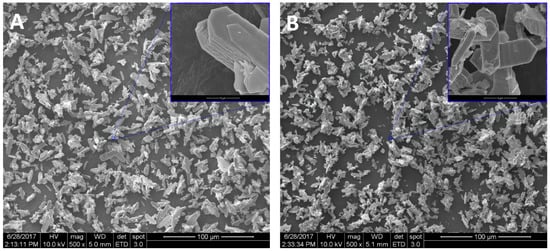 Obviously, the powders morphology is dramatically influenced by their crystalline nature as evident from the SEM micrographs shown in Figure 6 of SDC20R10S, related to both as-precipitated and calcined powders. The orthorhombic Sm-doped cerium hydrated carbonate exhibits a very peculiar morphology, being constituted by elongated bidimensional, hexagonal-like particles. The largest size of those particles is in the range of 10 to 20 μm, whereas the smallest ones are of some μm; the average particles thickness, on the contrary, is of only some hundreds of nanometers (see inset in Figure 6A). As predictable, this peculiar morphology is preserved after the calcination step (see Figure 6B), with the particles of fluorite-type Sm-doped ceria sharing this same shape and therefore severely impairing the powders forming step. In fact, an efficient compaction of particles with such a shape is rather difficult and, consequently, the achieved green density is quite low, thus making a satisfying densification upon sintering hard. Furthermore, and perhaps more importantly, the size of crystallite calculated by the Scherrer formula applied on (111) peak, is around 14 nm, i.e., well lower than the size of particles shown in Figure 6B. Therefore, these particles are indeed aggregates of many and definitely smaller grains so that, very likely, these aggregates will behave as hard agglomerates during sintering, thus totally jeopardizing the pellets full densification.