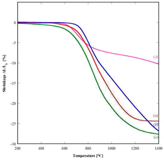 The sintering behavior of the various samples was investigated by thermodilatometry tests carried out in air using a DIL 402PC dilatometer (Netzch Instruments, Selb, Germany) with 5 °C·min−1 as heating rate up to 1400 °C.