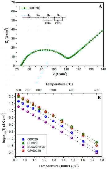 Nyquist plot for SDC20 at 500 °C (A) and Arrhenius plot of total conductivity for SDC20, GPrDC20, GDC20, and SDC20R10S (B).