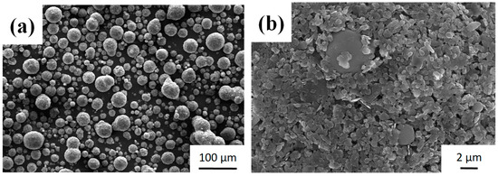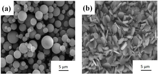 Commercially available PMMA (GW-T series, GuideWin Special Chemical Co. Ltd., Taoyaun, Taiwan) and BN powder (CNA04, National Nitride Technologies Co., Ltd., Taichung, Taiwan) were used as the starting materials for the spray drying process. After testing various weight ratios and processing parameters, PMMA and h-BN (weight ratio of PMMA to h-BN = 1:3) powder were separately added into deionized (DI) water (weight ratio of powder to DI water ratio = 1:4) to prepare powder-containing solutions. These solutions were then mixed together, magnetically stirred, and ball milled to obtain a homogenous PMMA and h-BN dispersed solution for the spray drying process. A CNK SDDNO-3 spray drying system (IDTA Machinery Co., Ltd., Taipei, Taiwan) was used to spray the PMMA/h-BN composite powder with the following process parameters: in air = 200–220 °C, out air = 80–120 °C, disc rotation speed = 30,000 rpm, and a feed rate of ~1.5 kg/h. The spray dried composite powder was examined using a field emission scanning electron microscope (JSM-6500F, JEOL Co., Ltd., Tokyo, Japan) to determine its powder morphology and cross section. The particle size distribution was obtained using a dynamic light scattering particle size analyzer (SALD-201V, SHIMADZU Co., Ltd., Kyoto, Japan). The specific surface areas of powder were examined using a surface area analyzer (ASAP2010, Micromeritics Instrument Corp., Norcross, GA, USA) with nitrogen gas adsorption using the BET method, while the oil absorption ability of the powder was investigated according to JIS-K5101/ISO787-5 standard [32,33]. The powder-added oil samples were prepared by mixing h-BN, PMMA, and h-BN/PMMA composite powder (coded as DP25B75) with linseed oil and placing the mixtures into a quartz plate with a size of 10 × 10 × 1 mm3 for light absorption evaluation ranging from 220–1440 nm (i.e., UVC-NIR range) using a UV-VIS spectrophotometer (UV-3600 UV-VIS-NIR Spectrophotometer, SHIMADZU Co., Ltd., Kyoto, Japan).