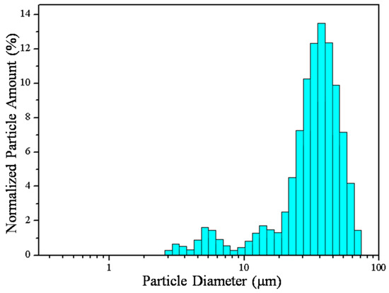 Powder morphology may affect the preparation of cosmetics. Figure 1 shows the SEM images of the starting PMMA and h-BN powder. PMMA is spherical with an average size of ~4 μm, as shown in Figure 1a, whereas boron nitride powder, shown in Figure 1b, is plate-like with an average size of ~2 μm. Figure 2 shows the spray dried DP25B75 composite powder. It can be noted from Figure 2a that sphere-like particles formed after the spray drying process. Figure 2b shows the cross-sectional view of DP25B75 powder, in which the plate-like h-BN powder was homogeneously distributed within a melted or semi-melted PMMA matrix. Figure 3 shows the particle size distribution of DP25B75 composite powder, for which a negatively skewed distribution or a multi-model distribution can be noted. The largest peak in Figure 3 (i.e., the mode) is 41.5 μm and the median size of DP25B75 powder is 30.5 μm, i.e., indicating that 50% of the particles are smaller than 30.5 μm and the other 50% are larger than 30.5 μm. The median size of DP25B75 is smaller than that of the TiO2/mica-BN powder (~60 μm) prepared through a similar process [26].