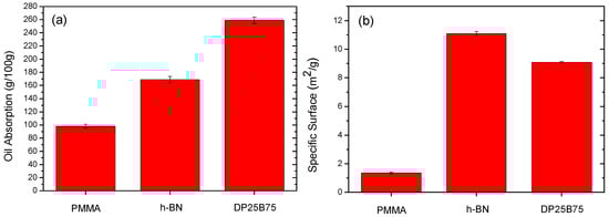 (a) Oil absorption and (b) specific surface area of PMMA, h-BN, and DP25B75 powder.