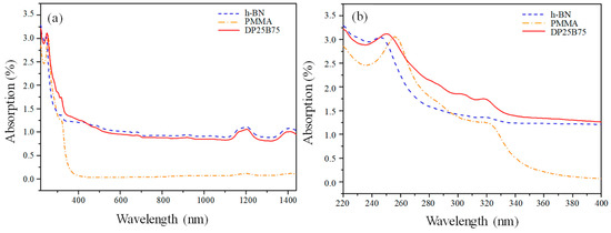 (a) UVC–near infrared (220–1440 nm) and (b) UVC–UVA (220–400 nm) spectra for powder-added oil samples prepared by adding PMMA, h-BN, and DP25B75 powder.
