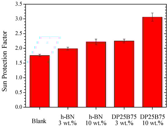 To simulate practical cosmetic applications, 3 and 10 wt.% h-BN or DP25B75 powder was added to Blemish Balm cream (i.e., BB cream). The sun protection factor, transmittance within UVC-NIR regions, and thermal conductivity of pristine and powder-added BB creams were investigated. Figure 6 shows the sun protection factors of pristine and powder-added BB creams. Blank BB cream exhibits a SPF of 1.76 that apparently increases after powder additions. The SPF is 1.99 and 2.22 with 3 and 10 wt.% h-BN addition, respectively. This is further improved when using DP25B75 composite powder. With 3 wt.% DP25B75 addition, the SPF is 2.25, which is higher than that of 10 wt.% h-BN. With 10 wt.% DP25B75, the SPF is 3.06, which is ~74% higher than that of pristine BB cream and ~38% higher than its h-BN counterpart. The SPF increases with increasing amounts of DP25B75 powder additions. Desired SPF may be achieved by adding more amount of DP25B75 powder or chemical organic agents. The larger the SPF is, the better the light absorption in the ultraviolet light region [37]. This indicates that BB cream with spray-dried DP25B75 composite powder exhibited superior sunscreen protection compared to its pristine h-BN counterpart.