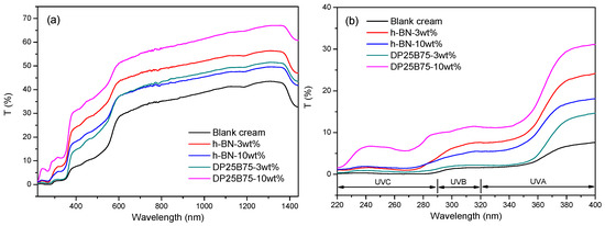 (a) UVC-near infrared (220–1440 nm) and (b) UVC-UVA (220–400 nm) spectra of BB creams with or without h-BN and DP25B75 powder.