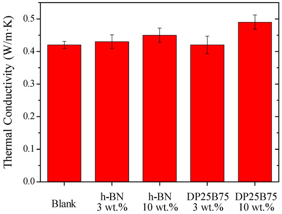 Thermal conductivity indicates the cooling effect on the skin after usage [38] and Figure 8 shows the thermal conductivity of blank and powder-added BB creams. The thermal conductivity is 0.42 W·m−1·K−1 for blank BB cream and exhibits no obvious improvement with only 3 wt.% of h-BN (0.42 W·m−1·K−1) or DP25B75 (0.43 W·m−1·K−1) addition. Significant improvement of thermal conductivity can be noticed with the addition of 10 wt.% h-BN and DP25B75. The thermal conductivity is 0.45 and 0.49 W·m−1·K−1 for h-BN and DP25B75, which corresponds to an increase of 7 and 17%, respectively.
