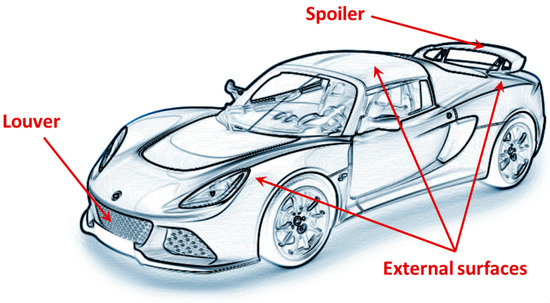 The solutions developed for adaptive aerodynamics can be easily transferred from the aeronautical to the automotive field. In the automotive field, adaptive aerodynamic applications include, but are not limited to, actuation of external surfaces, spoilers, and/or grill/louvers, as shown in Figure 2.