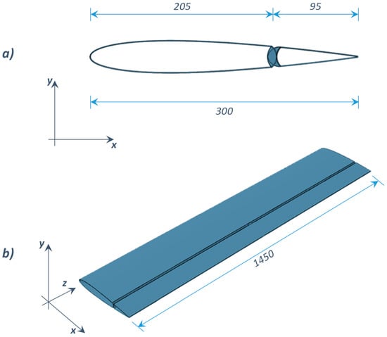 Figure 3. Spoiler and actuated elevator: (a) cross section; (b) isometric view (unit: mm).