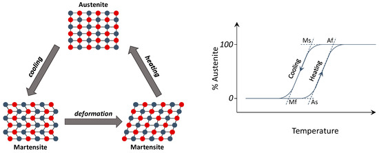 The Shape Memory Alloys are metallic alloys able to recover an initial prescribed shape when subjected to temperature variation. In particular, an increase of temperature beyond a prescribed threshold generates a phase transition from a martensitic crystal structure to a stable austenitic crystalline structure, as shown in Figure 5. Since the phase transition induces a rearrangement of the microstructural arrays, the SMA mechanical properties including the elastic modulus and the yield strength are significantly modified [130,131,132,133].
