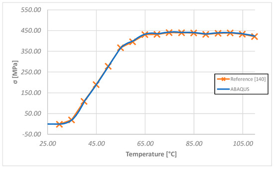 This analysis is aimed at the validation of the proposed simplified material model with respect to the literature data. Indeed, it does not describe the behavior of the SMA wire used as an actuator, due to the different boundary conditions. The results of the ABAQUS numerical test, in terms of stress as a function of the temperature, have been found to be in agreement with the data reported in [140], as shown in Figure 6, where the numerical test results are compared to the reference ones. Thus, the validated material model has been used in the following test cases, tailoring the number of SMA wires according to the specific application.