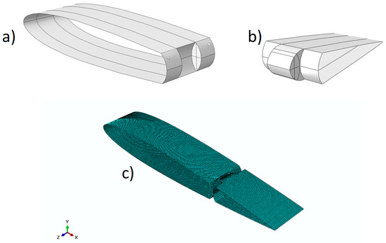 Figure 7. Case study #1 (details): (a,b) geometries; (c) FEM.