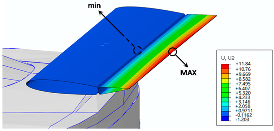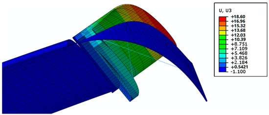 Finally, in Figure 11, the structure in actuation mode is reported. Again, for this configuration, the requirement on displacements (10 mm) needed to obtain a significant aerodynamic field variation has been satisfied. The maximum values of stress and strain observed during the actuation in the SMA wires are 350 MPa and 400 με, respectively. However, it is worth noting that modifications to the number and the length of the SMA wire can help to tailor actuation displacements.