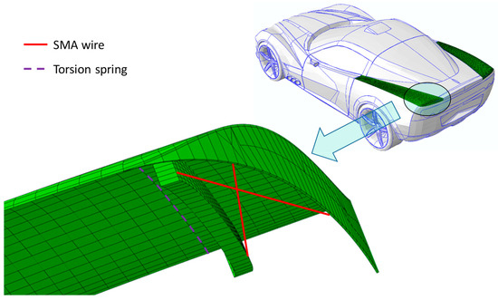 Figure 10. Rear upper panel actuation, details of the numerical model, and locations of SMA and torsion spring.