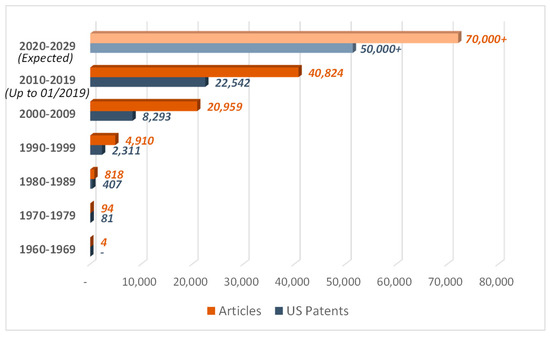 Figure 12. Articles published and U.S. patents issued. Sources: Scopus and Uspto. Keywords: “Shape Memory Alloy” OR “Nitinol”. Retrieved: 22/01/2019.