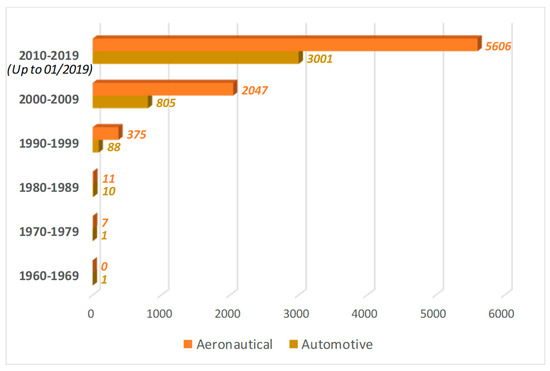 As a matter of fact, the majority of the applications presented in the literature are confined to the aerospace field, where performance requirements are demanding, as shown in detail in Figure 13, where the number of articles clearly belonging to the aeronautical or automotive fields are compared.