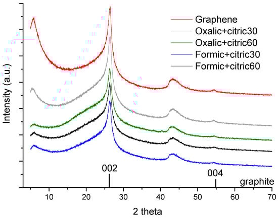 - Stobinski, L.; Lesiak, B.; Malolepszy, A.; Mazurkiewicz, M.; Mierzwa, B.; Zemek, J.; Bieloshapka, I. Graphene oxide and reduced graphene oxide studied by the XRD, TEM and electron spectroscopy methods. J. Electron. Spectrosc. 2014, 195, 145–154. [Google Scholar] [CrossRef]