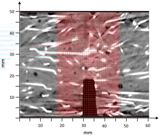 Analysis of fiber orientation, including the compilation of fiber data into a finite element mesh, was completed using the Fiber Composite Material Analysis module of VGSTUDIO MAX [26]. A section of the CT image from a beam with overlaid finite element mesh can be seen in Figure 1.
