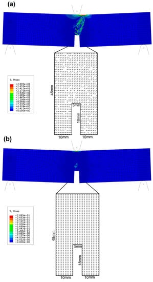 Two numerical models of the three-point bending test with different fiber orientations. (a) model with gradually changing fiber orientations, (b) model with all fibers oriented perpendicular to the longitudinal axis of the beam.