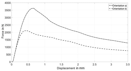 Force displacement curves resulting from the two numerical models of the three-point bending test with different fiber orientations.