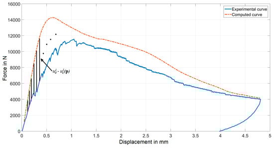 In this equation, p represented a variable vector, here specifically containing the six unknown material parameter variables. The vector ue contained the force values at each of N points along the force-displacement curve, corresponding to the equidistant displacements, measured during the experiments. The vector uc contains predictions for the force values at each of the N points. These predicted values were generated through test simulations, attributing to the material parameters estimated values corresponding to the current iteration of the optimization algorithm. In Figure 6, differences to be minimized are schematically visualized.