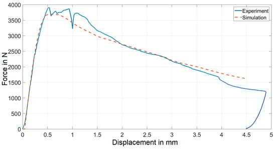 The inverse problem was found to be well-posed and the procedure converged to the solution after several iterations. The parameter values, which resulted as the solution to the inverse problem are listed in Table 1. The comparison between experimental and numerical force-displacement curves generated by employing these parameters is visualized in Figure 7. Good agreement between the two curves proves that the adopted approach is capable of capturing the overall mechanical response of three-point bending experiments.