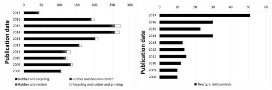 Number of patents on recycling of rubber. Countings according to Espacenet.