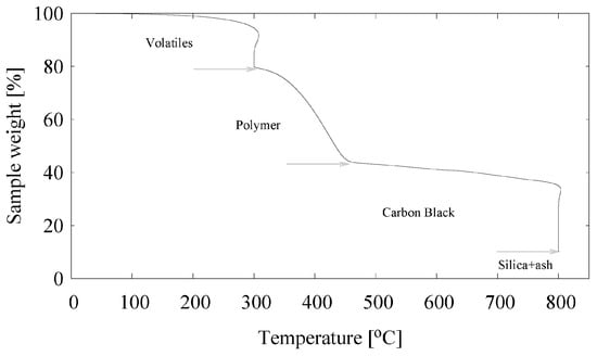 The introduction of silica in passenger car tire treads started more than 20 years ago []; therefore, whole passenger car tire granulate of recent origin must contain a certain percentage of silica. By Thermo Gravimetric Analysis (TGA), Figure 2 and Table 1, the amount of silica in a compount can be determined. Commonly the amount of polymers is defined to be equivalent to the weight loss of the sample between 300 and the point of a sharp decrease in weight at about 450–550 . In Figure 2, the amount of volatiles, to include mainly process oils, wax and other lightly evaporating components, ranges from 100 → 79 wt% = 21 wt%, the polymers from 79 → 44 wt% = 35 wt%, carbon black from 44 → 10 wt% = 34 wt% and silica + ash from 10 → 0 wt% = 10 wt%. By setting the polymer content to 100, the amount of volatiles, carbon black and silica + ash can be easily converted into phr’s (grams per hundred grams of polymer).