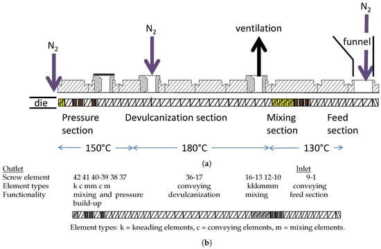 Continuous devulcanization was performed in a KrausMaffei ZE 25 UTX co-rotating twin-screw extruder (KraussMaffei Technologies GmbH, München, Germany), length 42D with D = 25 mm, with 3 de-aeration positions between the supply funnel and outlet and an elongated die, with dimensions of a rounded rectangular slit of 20 mm × 40 mm and length of 100 mm, as can be seen in Figure 5a. The screw design was based on a minimal shear concept as detailed in Figure 5b.
