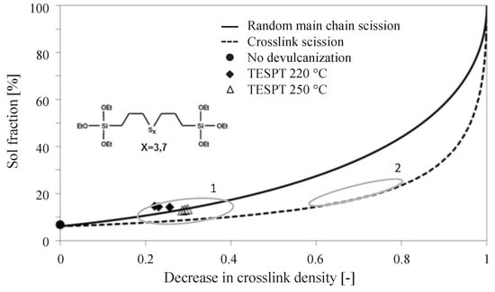 Degree of devulcanization of a silica-based tire tread compound as shown by a Horikx-Verbruggen diagram. 1 = Measurements for silica-based devulcanizates, as measured by Saiwari [], 2 = Range of best devulcanized carbon black-based samples [].