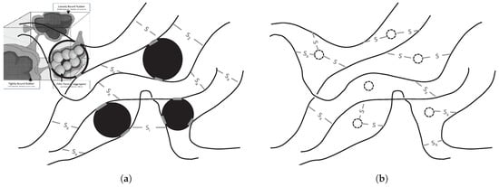 Differences in network structure between carbon black-based compounds and silica-silane-based compounds. (a) Sulfide bonds in carbon black rubber. Insert bound rubber by Leblanc []. (b) Sulfide bonds in silica-silane-based rubber. High amount of (mono)sulphidic bonds between silica and rubber.