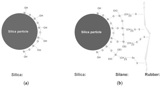 Chemical bonds between silica and rubber by silane bridges []. (a) Simplified schematics of the surface chemistry of silica. (b) Silane bridges between silica and rubber. Part of the silanol moieties are still unoccupied.