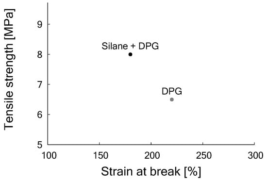 As the improved results due to the addition of DPG show, a certain amount of free silanol moieties is still present on the silica surface. To make use of these for building an additional silica network, a silanization step before the revulcanization process with a coupling agent (e.g., TESPT) is again necessary to further improve the tensile properties. By this secondary silanization, as shown in Table 7, the tensile strength further improved to 8 MPa after vulcanization for t+2 min at 170 under pressure in the Wickert press (see Figure 9).