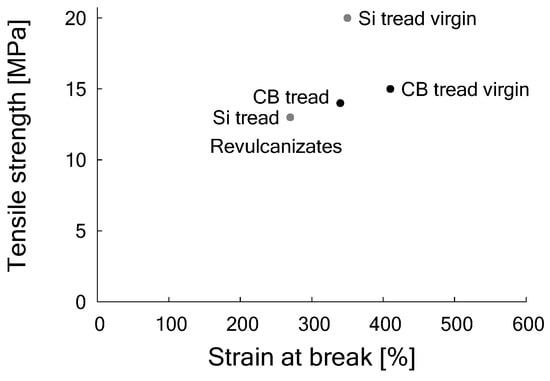 To emphasize the benefits of separating tire treads from the rest of the tires before processing, it was shown with tread compound studies with 80 phr carbon black or 90 phr silica as fillers that it must be possible to keep the tensile properties of a revulcanizate of a devulcanized silica-based compound at approximately 70%, from 20 MPa to 13 MPa, while for a carbon black-based compound at around 95%. The decrease in the tensile properties between revulcanized silica-based compounds and the original material, compared to those of the carbon black-based compounds, indicates that separation of the different tire parts before devulcanization to separate silica-containing and non-containing parts, may significantly improve the overall quality of the devulcanizates.